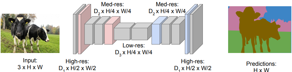 Segmentation은 각각의 픽셀을 분류하는 작업이기 때문에 원본 이미지 내 각 사물들의 위치를 보존하는 특성맵이 필요하다. 하지만 CNN은 연산량 문제로 pooling layer가 필연적인데 여기를 통과할 때마다 이미지의 크기가 줄어들어 위치에 대한 세부적인 정보는 조금씩 잃게 된다. 심지어 네트워크 끄트머리의 FC layer를 통과하면 위치에 대한 정보는 아예 사라진다. 따라서 이러한 부분을 고려한 네트워크가 필요하다.