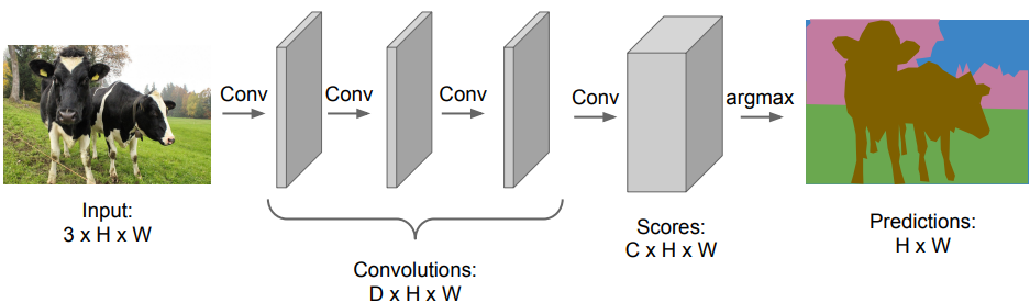 사실상 위 그림의 두 구조를 보면 다른 점이 있다. 아래 그림은 특성맵의 크기가 점차 작아지는데 위쪽 그림은 특성맵의 크기가 그대로다. 후자가 초기에 제시된 Conv layer를 사용한 구조인데 특성맵의 크기가 원본과 동일하기 때문에 각각의 픽셀의 위치 정보들이 그대로 보존된다. 위 그림의 아래쪽 그림에서 heatmap의 해상도가 낮은 것은 특성맵의 크기가 줄어들었기 때문인데 위쪽의 초기 구조에서는 특성맵의 크기가 원본과 동일하기 때문에 원본과 동일한 해상도를 지닌 채로 각각의 픽셀이 분류된다. 즉 원본의 픽셀 수 만큼 각각의 픽셀이 자신에 해당하는 이미지의 특징을 나타내는 것이다. 하지만 Conv net을 원본 이미지 크기를 그대로 밀고 나가며 계산하기 때문에 Sliding Window보다 계산량이 적다 해도 여전히 연산이 많은 부분이 있다.