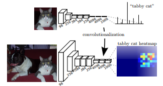 Sliding Window의 연산상의 문제와 위치보존의 문제를 해결하기 위해 FC layer를 C(클래스 수) x H(세로) x W(가로) 크기 만큼의 Convolutional layer로 대체하는 방법을 사용한다. FC layer는 고정된 크기의 이미지만 입력받을 수 있다는 취약점도 존재한다. 위 그림의 아래 그림을 보면 FC layer는 고양이를 분류하기 위해 고양이만큼 잘린 이미지를 사용할 수 밖에 없지만 FC를 Conv로 바꾼 구조에서는 이미지 크기에 구애받지 않는 것을 확인할 수 있다. 이는 연산량의 감소에도 큰 영향을 미치는데 이 부분에 대한 자세한 내용은 아래 첨부한 게시글에서 확인할 수 있다. Conv layer를 사용한 구조를 보면 해상도가 낮기는 하지만 고양이가 있을 가능성이 높은 지역에 heatmap 값들이 높게 표현된 것을 확인할 수 있다. 이처럼 FC를 Conv로 대체하면 연산량을 줄이면서도 원본 이미지 자체에서 위치정보를 어느정도 보존할 수 있는 것이다.