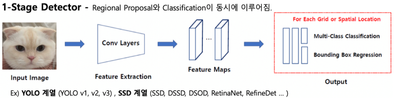 1-stage object detector는 region proposal과 classification이 동시에 이루어지는 구조이다. 위 사진에서 보면 conv layer에서 특징 추출이 이루어진 뒤 특성 맵에서 각 grid or spatial location마다 바로 분류가 이루어진다고 나와있는데..... 사실 저대로는 직관적으로 이해가 잘 가지는 않을 것이다.