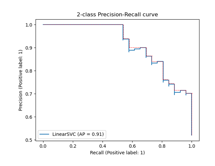 AP는 그래프 아래의 넓이를 구한다는점에서 AUROC와 유사하지만 조금 다른 점이 있다. AP는 위 그래프와 같이 PR곡선이 단조적으로 감속하는 그래프가 되도록 수정한 후 그 아래 면적을 구하는 방식으로 산출된다는 것이다. 그렇다면 왜 이러한 변환을 시켜주는 것일까? 그 이유는 위의 불균형한 데이터셋의 그림을 보면 알 수 있다. 임계값이 맨 위에서 내려올 때 처음에는 양성 1개가 양성으로 예측되기 때문에 precision은 1이다. 조금 더 내려오면 양성1개 음성1개가 둘다 양성으로 예측되므로 precision은 0.5가 된다. 그다음 더 내려오면 양성2개 음성1개가 양성으로 예측되므로 precision은 0.66이 된다. 보면 precision의 값은 실제 음성이 양성으로 예측될수록 낮아진다. 그 결과 precision의 값은 계속 요동치게 되고 모델이 양성을 제대로 판별하는지 평가하는데에 지장을 준다. 따라서 좀 더 정확한 평가지표의 구성을 위해 음성 데이터의 영향을 제거한 것이 AP인 것이다.