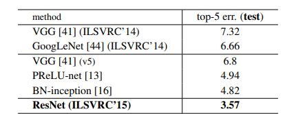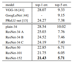 50층 이상의 resnet 구조에서부터는 bottleneck 구조가 적용된다. 이러한 구조를 활용한 resnet은 놀랍게도 152층으로 아주 깊게 쌓은 층도 효과적인 성능을 나타내고 있음을 확인할 수 있다. 서로 다른 깊이의 resnet을 앙상블 하면 성능은 더욱 개선된다. 그리고 이 앙상블 모델이 2015 ILSVRC에서 우승을 차지했다.