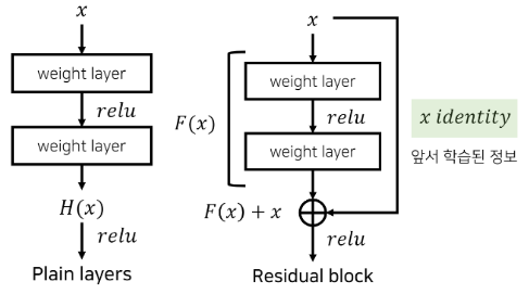 residual mapping과 identity mapping은 shortcut connection을 통해 구현되는데 이는 하나 이상의 층을 건너뛰게 만드는 방식이다. 위 그림을 보면 입력값으로 활용되는 x가 weight layer를 건너뛰고 F(x)에 따로 더해지고 identity mapping에도 활용이 된다. F(x) + x = x의 식에서 x는 shortcut connection을 통해서 전달된 값인 것이다. 이러한 identity shortcut connection은 추가적인 파라미터나 복잡한 계산을 필요로 하지 않고 아주 간단히 구현이 된다!