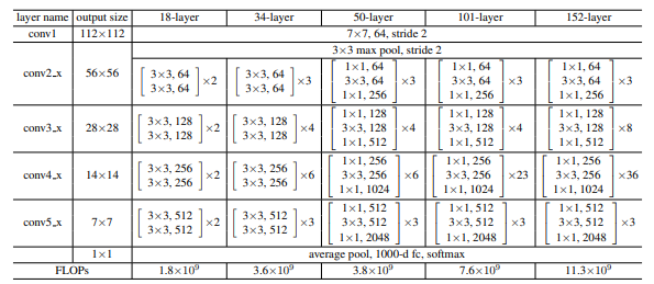 이때 헷갈리지 말아야 할 점은 zero-padding이나 projection shortcut은 residual block을 첫번째로 돌 때 적용된다는 것이다. 위 그림의 34-layer을 보면 conv2_x에서 conv3_x으로 넘어올 때 처음에 conv3_x에는 28x28x64의 특성맵이 입력된다. conv3_x를 한차례 통과하고 나서의 출력값은 28x28x128이다. 따라서 shortcut connection을 진행하기 위해서는 zero-padding이나 projection shortcut을 적용해 두 특성맵의 차원을 맞춰주는 과정이 필요하다. 이 과정을 한번 진행하고 나면 conv3_x를 다시 돌 때는 입력값이 28x28x128이 되기 때문에 identity shortcut을 적용할 수 있다. 그렇게 총 4번 residual block을 도는 과정에서 처음을 제외한 나머지 3번동안 identity shortcut이 적용되는 것이다. 물론 이 때에도 projection shortcut을 사용할 수 있겠지만 굳이? 이다. 한번 아래의 표를 봐보자.