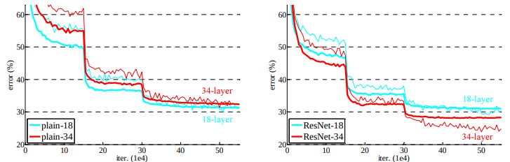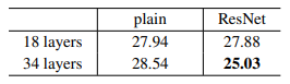 다음은 resnet 모델을 실험을 통해 비교해놓은 파트이다. plain networks에서는 더 깊은 네트워크의 오류가 높은데 18, 34층의 네트워크 모두에서 배치정규화가 적용되기 때문에 이는 기울기 소실의 문제로 보기는 어렵다. 본 논문에서는 깊은 네트워크에서 수렴률이 매우 낮아서 오류가 더 높게 나오는 것으로 추측하고 있다. residual networks에서는 모든 shortcuts에 대하여 identity mapping이 적용되고 차원을 늘리는데에(다음 residual block으로 넘어갈 때) zero-padding shortcut이 적용되었는데 얕은 층보다 더 나은 성능을 보였고 degradation 문제는 확실히 줄어든 모습을 보인다. 그런데 18 layer의 pain, resnet error를 보면 별로 차이가 없지만 resnet에서 수렴이 더 빠르다.(라고 논문에서 말하지만 내 눈에는수렴 속도엔 차이가 없어보이는디?) 이는 resnet이 최적화를 용이하게 해 수렴이 더 빨리 되는 것이라고 한다.