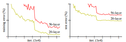 값이 수렴하기 시작하자 이제는 degradation 문제가 나타났다. 이는 네트워크가 깊어질수록 성능이 저하되는 문제였다. 위 사진을 보면 56개의 층을 가진 네트워크가 26개의 층을 가진 것보다 에러가 더 높게 나타는 것을 알 수 있다. 이 현상은 overfitting 문제는 아니었다. 보다시피 training error조차 깊은 층에서 더 높았기 때문이다.
